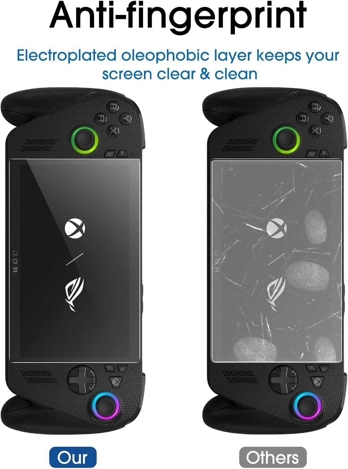 【Anti-Fingerprint Resistance for a Cleaner Screen】Annoyed by fingerprints? Our Xbox ROG Ally X screen protector comes with a transparent layer that is hydrophobic and oil repellent. After testing, they effectively prevented 99.99% of fingerprints caused by sweat and oil stains